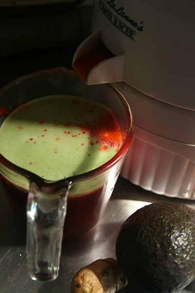 i bought some of those produce thinking i could turn them into juice with my parents' juicer. my father fixed me up a juice drink using ginger, apple, cucumber, beet, and carrot. it had a magenta color and tasted spicy (from the ginger) and cucumbery. it was also sweet, but i couldn't tell whether that was from the apple, beet, or carrot. it tasted okay but borderline awful; i think maybe because i wasn't used to it, but i think i could learn to like it. i did feel more energized afterwards, like eat a big fruit and vegetable salad.