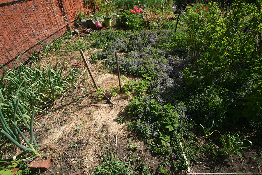 in the afternoon i went to visit my community garden for the first time in a long while. it was another hot day with temperature hitting 85°F in cambridge (thankfully it wasn't humid). helen - one of the gardening veterans - was there testing out the faucets (one of them still wasn't working). i was surprised when i saw my plot completely covered in a green/purple carpet of ground ivy, dotted with spreading raspberries, chinese lanterns, and mint. it's like a war between invasive plants and looks like ground ivy is the clear winner. the garlics i planted a year ago are doing surprisingly well and so have the scallions i raised from saved roots.