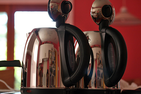 as an experiment, i filled both aroma electric kettles with the same amount of water (0.6L) and started them at the same time to see which one would finish boiling first. i was feeding the fish right when the boil was about to be done when i noticed the light in the aquarium shut off. it took me several seconds to piece together the clues before realizing the circuit breaker for the kitchen had popped because of the overload due to running both kettles simultaneously. i quickly ran down into the basement to flip back the breaker and continue the experiment (it didn't fail the second time). my kettle finished first, followed by the "new" kettle a few seconds later.