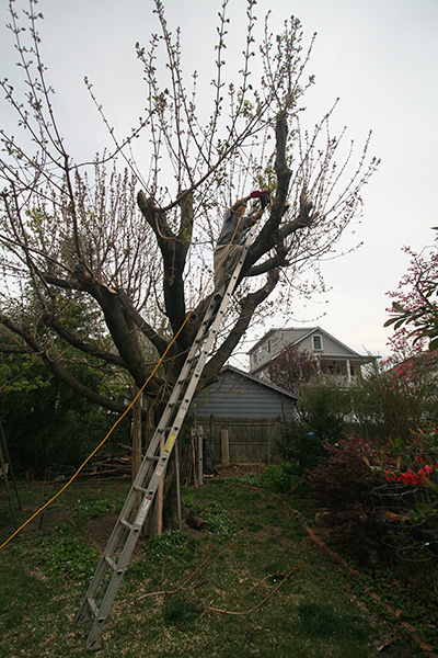 when my father returned home in the afternoon, i helped him prune the backyard maple tree. since we last gave it a major trim in order to get more sun exposure in the garden, the tree has grown many more new branches (mostly vertical suckers) which now threaten to eclipse the garden once again.