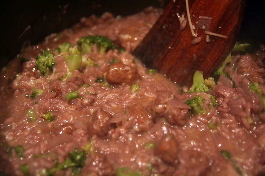 i was only making red wine risotto because i didn't have any white wine left. while pouring out the alcohol i took a few sips from the bottle. since i don't normally drink, that was all it took for me to get tipsy. risotto is perhaps not the best recipe to make when you're hungry because it takes a while to prepare (not complicated, but all that slow simmering and stirring takes time). although red wine risotto tastes the same as white wine risotto, it looks something awful, a very non-appetizing purplish-brown color.