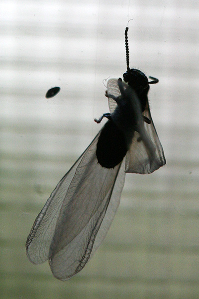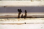 the only dead body i saw was something that looked like a winged ant trapped in a spiderweb. maybe it's not termites after all! maybe they're just ants! but a quick online reference check revealed that it was in fact a winged termite. my sister helped me move the heavy desk away from the windowsill. that's where i noticed something that looked like powdered wood near the top of the baseboard. that's probably the entry point. i then went to the basement,
