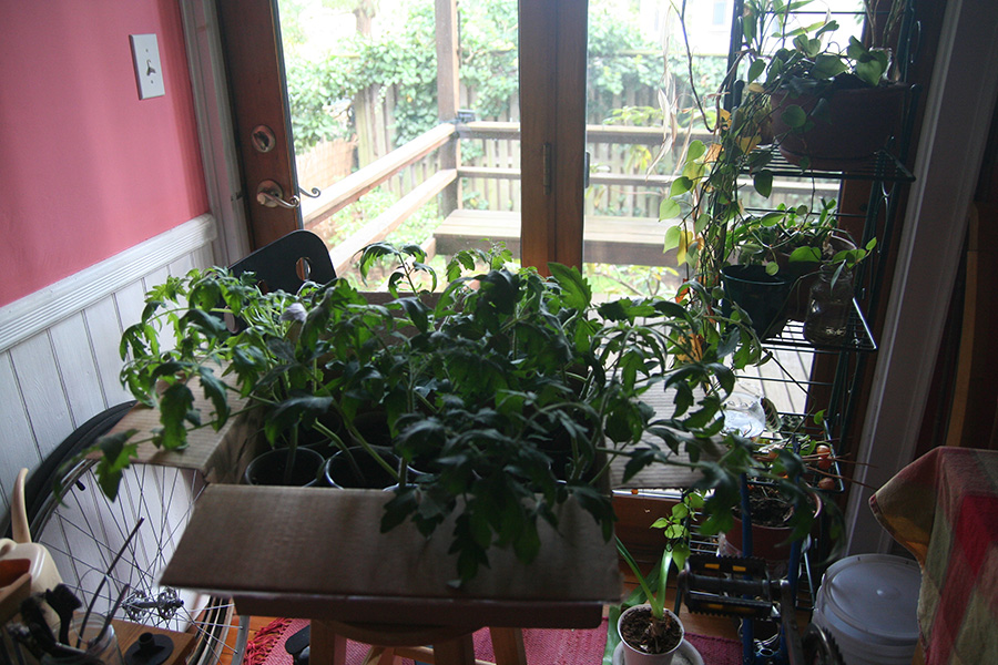 i moved out all my tomatoes. i have no choice but to transplant them since they won't fit inside the closet anymore. should they succumb to a sudden bout of low temperatures i won't be too sad since it's cheap to buy new seedlings. i wonder if i left them in the closet too long because they look spindling, like they didn't get enough light.