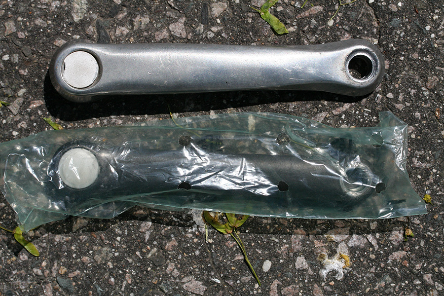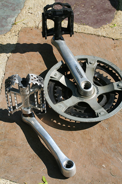 from that point it was a simple matter of taking the trek 720 left crank arm (plus pedal) and attaching it to my trek 800. both arms were fortunately the same length (170mm) so there was no incompatibility issues. it's not the prettiest fix but it works. for kicks, i installed the black crank arm onto the trek 720 frame (minus pedal).