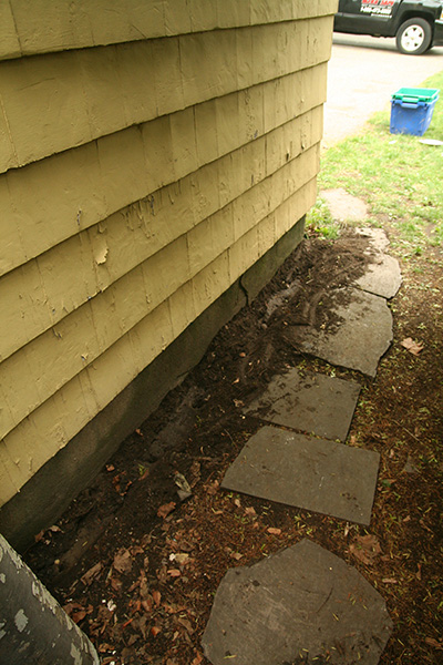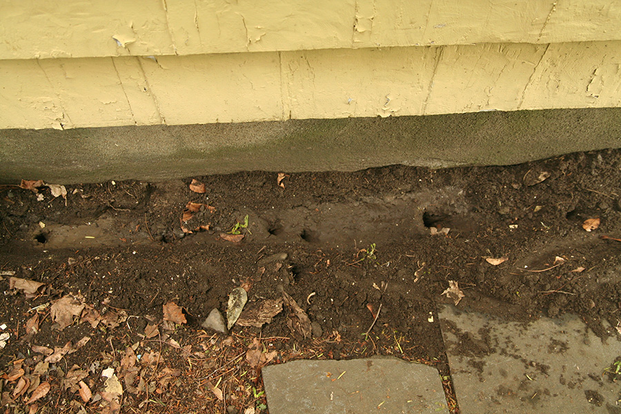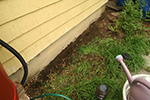 while mark did the termidor injection, ron was busy digging the trenches with a hoe. he was also responsible for drilling some holes, along the driveway by the foundation of the house and along the front stoop. after mark finished his injection work, ron went back and filled up the holes with cement, including finishing the patches on the driveway with black spray paint to better conceal the cement.