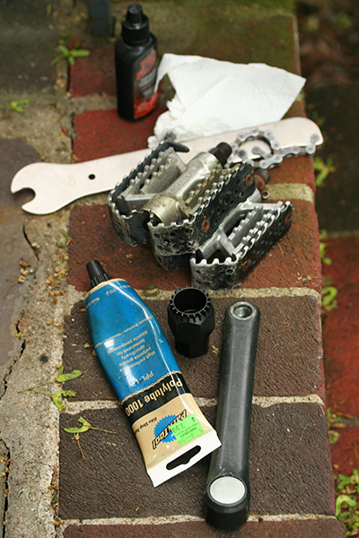i re-installed the cranks, this time replacing the left crank arm with my spare black one and putting on matching triple trap pedals.