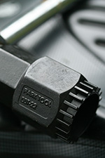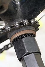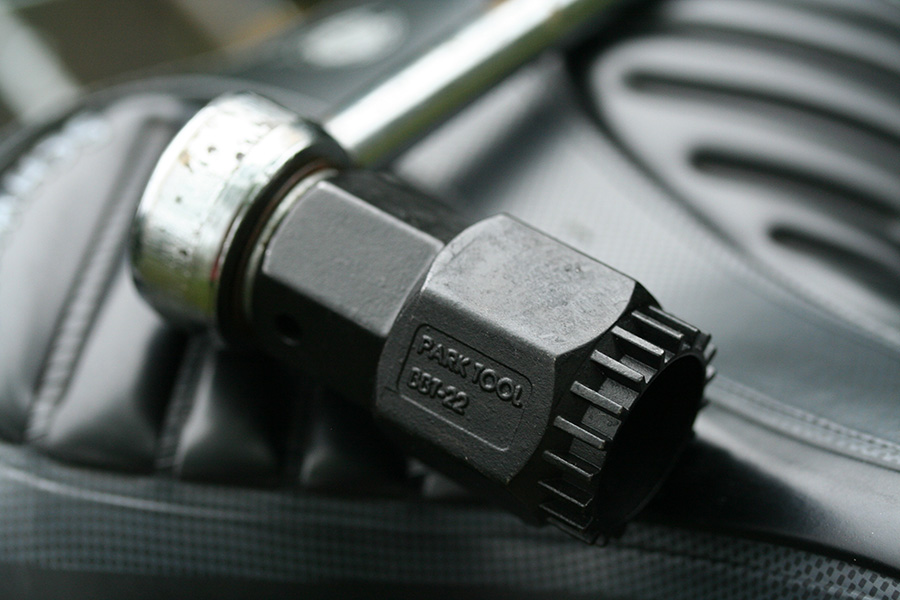 unable to remove the lockring (and thereby not being able to access the splined cup on the non-drive side), i decided to try removing the cup on the other side (drive side). since there's nothing to secure the bottom bracket tool, it had a tendency to come lose whenever i tried to apply some pressure with the socket wrench. after a while (and some choice swearing) i realized that wasn't going to work either. at least i didn't scrape my knuckles which is usually what happens when i do any sort of bike stuff that involves wrenching and torquing.