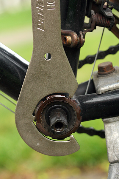 after removing the crankset, it was time to use the new bottom bracket removal tool. i was happy it fit the splines perfectly since i wasn't so sure after reading that it was designed for shimano octalink and ISIS drive bottom brackets (i have neither). i tried removing the lockring on the non-drive side but it wouldn't budge. i doused it with lubricant and tapped it with a flat screwdriver and a mallet when the specially-designed lockring wrench (park tool HCW-5) didn't work.