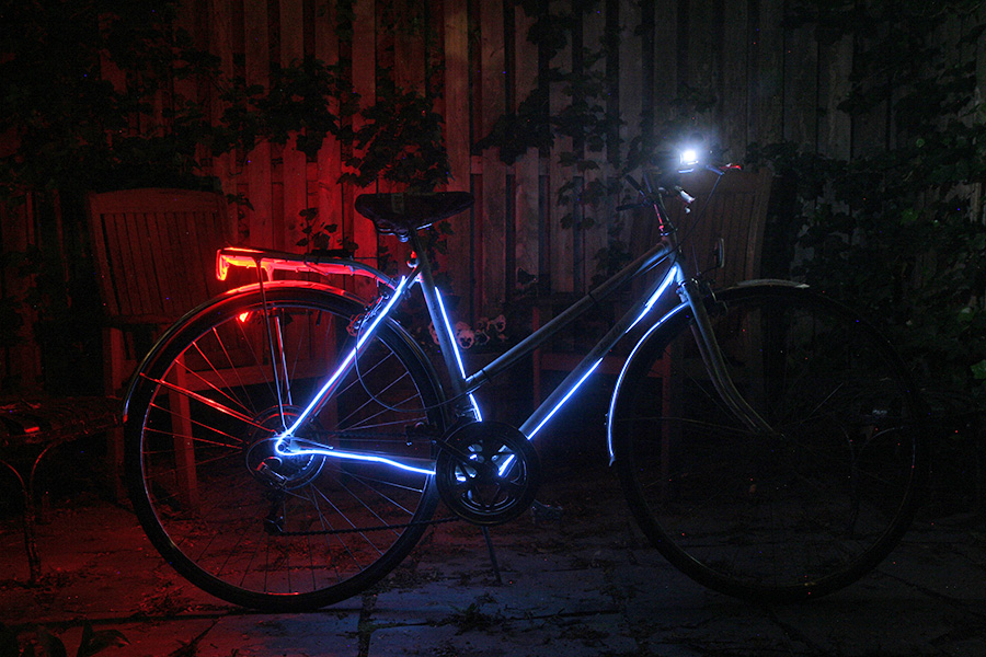 i put extra tape near the bottom bracket because i didn't want the wire to come loose and grind up in the gears. matched with my flashing rear blinker and front head light, it's pretty eye-catching. the wire itself has 3 modes: constant on, quick flashing, or slow flashing. at one point some teenage girl stuck out half her body from a moving car window and screamed something in my direction. with my poor hearing i couldn't catch what she was saying.