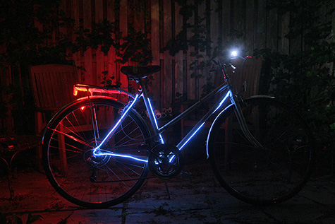 i couldn't wait for it to get dark so i could ride my newly-suped-up fuji bike. earlier i taped the 10ft length of electroluminescent wire to the frame. i had enough wire to cover both seat stays and chain stays, the seat tube, and the down tube. unfortunately there wasn't enough to cover the top tube nor the front forks. the tape is only a temporary measure: if i like the look, i'll use plastic ties to make it more permanent.