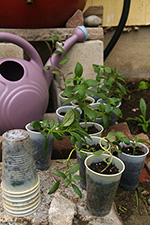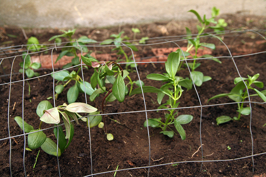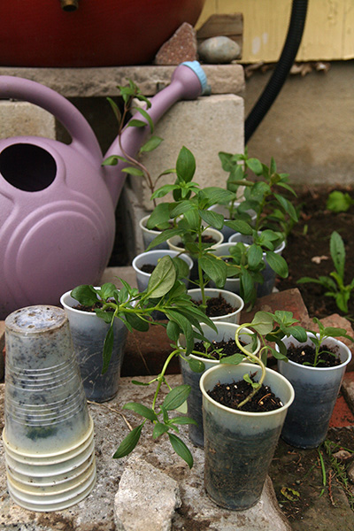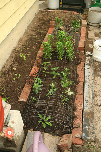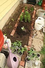 i discovered that snapdragons like to be planted close (6"), since they're not particularly bushy plants. while it's too late to rectify that in my community garden plot, i made sure to group them closer together here in belmont. i worked the soil a little bit more, uprooting hidden chinese chives and grass clumps with a cultivator, making sure i wasn't digging too close to the house where they pumped termidor. i also tossed any rocks i found. i formed another row of bricks in the back, partly as a marker to show where the exterminators did their trenching work, but also so i could step across the garden area without walking in the soil. i actually quite enjoy laying down bricks in the garden; reminds me of days long ago playing with lego blocks.