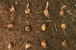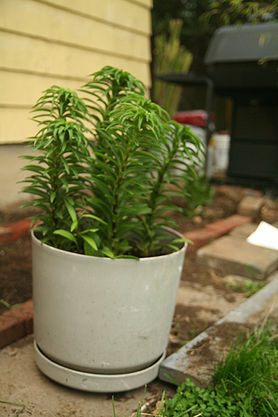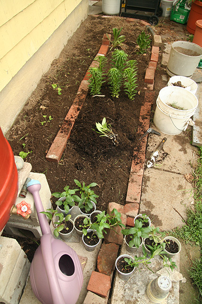 my father planted some 'cosmopolitan' lilies in a container last year that i wanted to transplant into the southeast corner garden. dumping them out of the container exposed a mass of roots. i had to divide everything with a small saw. unfortunately the roots are somewhat delicate and most of them fell off when i tried to clear away the dirt from the lily bulbs. i was surprised to find many baby bulblets; not all of them produced, just a few. i picked them off and planted them on the western side of the house with the other bulbs and perennials. there were 7 adult lily plants but since they didn't fit my arrangement, i removed the 7th to the southwestern corner of the yard along with the orange daylilies.