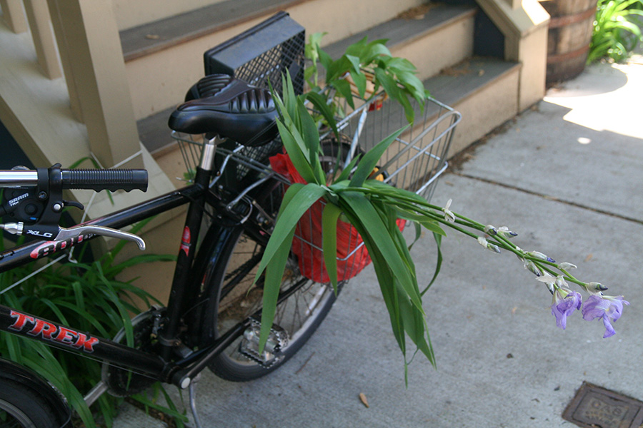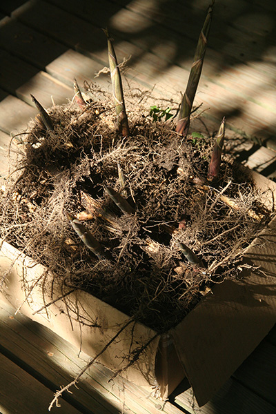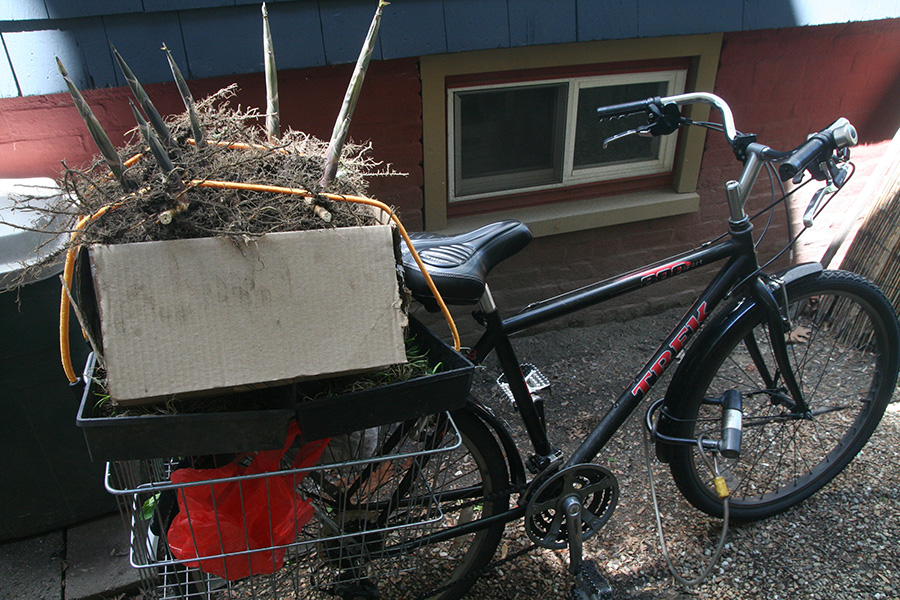 i didn't realize my parents were calling me because i left my cellphone inside. i only saw them when they'd already pulled up to the front of my house. my father had dug up some fresh bamboo this morning and thought they might be a hot item at the plant swap i was going to later. they dropped them off on their way to chinatown for a supply run.