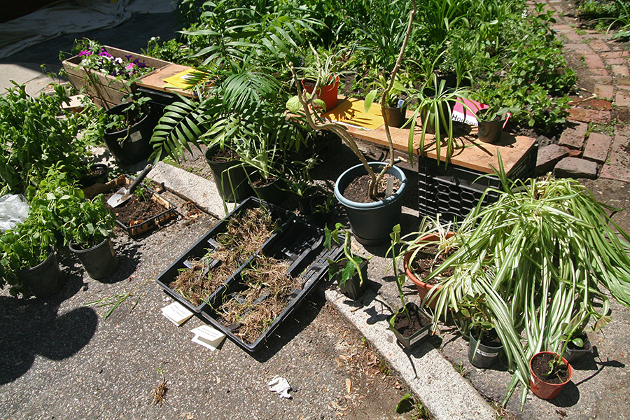 i left close to noontime for the mid-cambridge plant swap at fayette park. it was my first time so i didn't know what to expect. in my mind i was thinking it'd actually be a genuine swap, where people would go around trading plants. how it works in practice however is people just leave their plants and whoever wants them can take them even if they don't have anything to swap. i don't like this system because the good plants were immediately snatched up, sometimes before they even made it to the "show room" floor.