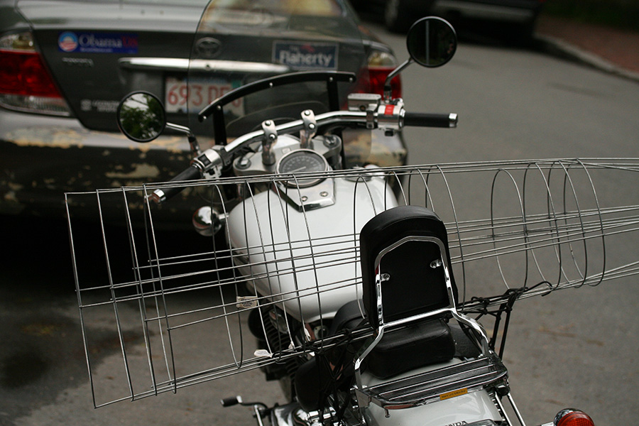 the tomato cages presented a problem: how do i get them back home on the back? i ended up strapping them horizontally on the rear seat of my bike with my bungie netting. that made the profile of my motorcycle nearly 4' wide, so i was careful to stay in the center of the road and not stray to the side and accidentally scratch any parked cars with the pointy ends of the cages.