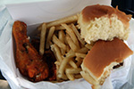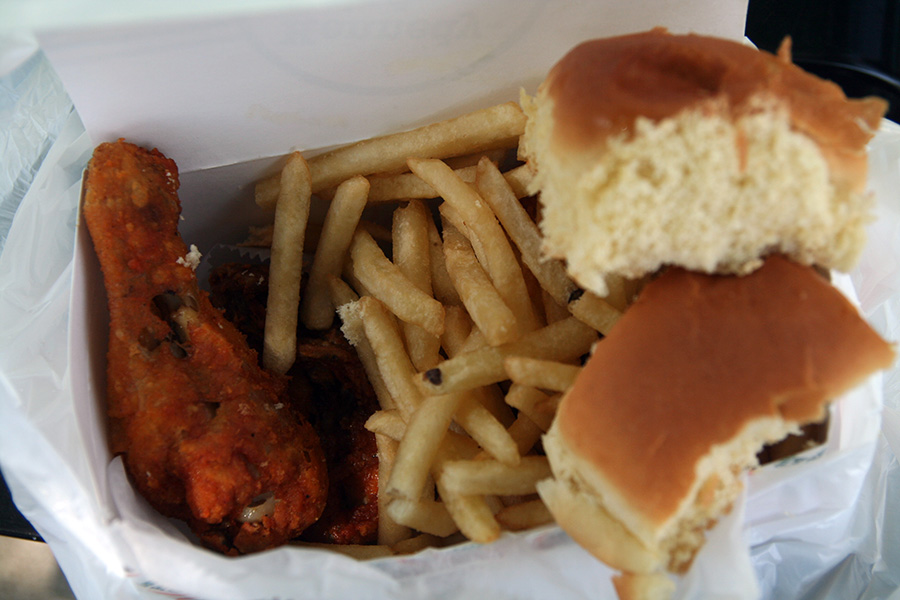 because i haven't had fried chicken in a while. fries were already salty so i didn't need any ketchup, which was included along with several packets of hot sauce (which i didn't use either). i ate on a metal bench underneath a tree, watching the traffic go by. i finished a drumstick and ate half a thigh before i was full; i closed the box, saving the rest for later.