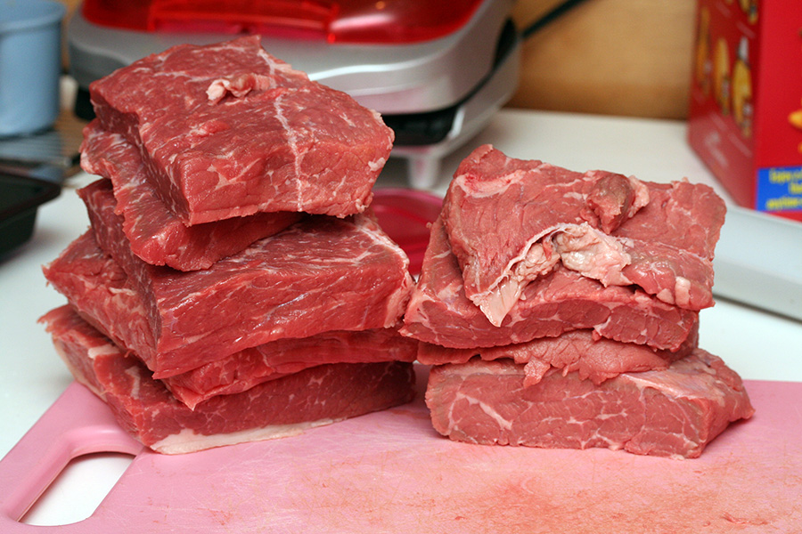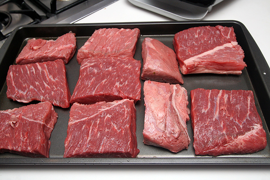beef round roast (bottom round, $2.99/lbs., $11.51) and cut it into rectangular planks, about 4x4" and less than an inch thick. i then put them on a cookie sheet and placed them in the freezer. my father said tomorrow he'd help me cut them into smaller pieces with the meat slicer, saving me the trouble of having to do it myself.