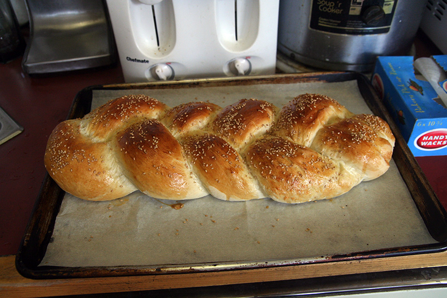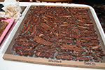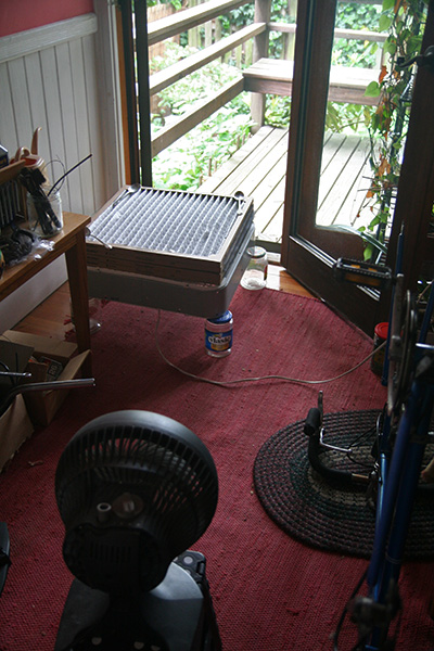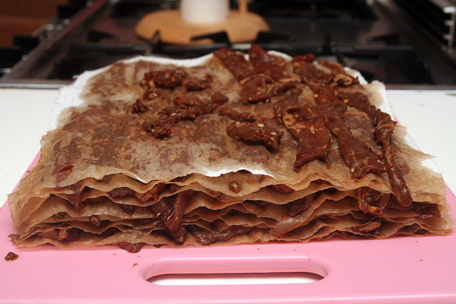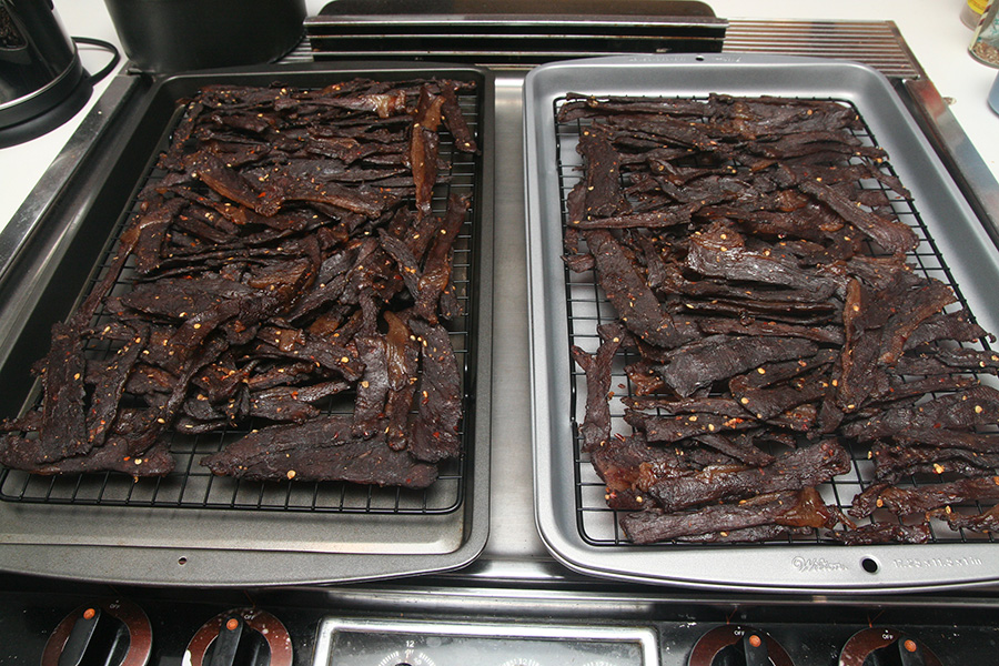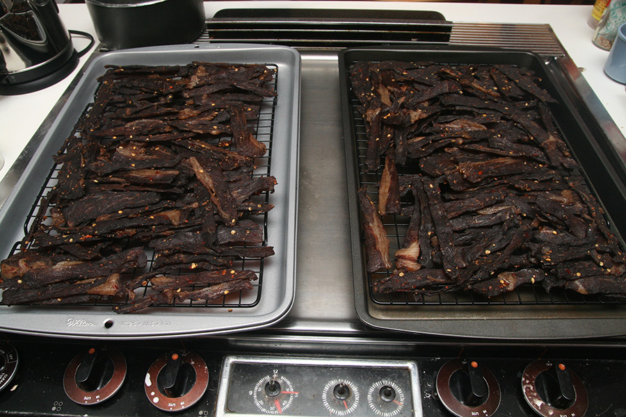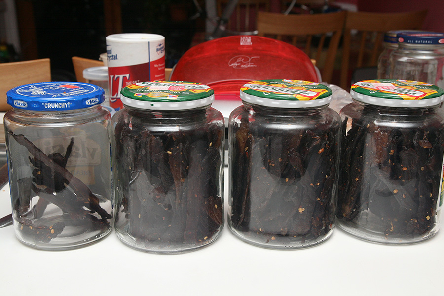 i stopped the fan 12 hours later at 10:30PM. throughout the day i rotated the filters a few times, moving the topmost rack to the bottom to get more blowing time. into the oven they went, loaded onto 2 wire racks sitting on bake sheets. i then cooked them for another hour at 180°F. the final result was 3 jars of beef jerky and change. they tasted just as good as the ones i made before, a complexity of flavors (salty, spicy, sweet, smoky, chewy). these have more fat on them than usual, but if they're eaten quickly enough it won't be a problem (only when they're in storage for a long time do the fat parts go rancid).