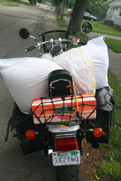 * peony show (smell like rose-scented turkish delights) * cutting a few peonies for indoors * sunning my pillows * taking them home to wash * motorcycle chased by yappy dogs * bird nest in the tree * loading up the motorcycle * buying some corn (12 for $2 - less than 17¢ per ear, corn isn't even in season yet) * planting some more seeds (zucchinis, cucumbers, and a host of vining plants including moonflowers, morning glories, cypress vines, and korean cucumbers, finally my mother's bell pepper plant) * removing termite mulch * dead heading the irises * bird nest in maple tree and protective mother bird (robin?) * sister's attempts to dehydrate hailey; hailey going to the bathroom every 20 minutes (killing the lawn in the process) * bike lock arrival (OG mini u-lock with security cable, $14.95) * celtics-76ers game (pierce fouls out with 4 minutes left in the game but boston wins anyway)