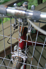 eyelets on bike frame. simple in theory, difficult in practice apparently. the eyelets aren't exactly aligned in a straight line. i almost had the screw all the way across but since the alignment is off i wasn't able to get it to come out the other side. maybe with some more work i could it to work; or i could go with a smaller diameter screw and just pass it through without threading into the eyelets. it would probably strip the threads inside the eyelets but it would work. after suffering a few mosquito bites and the sky beginning to darken, i decided to call it a night.