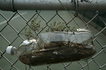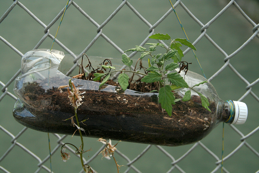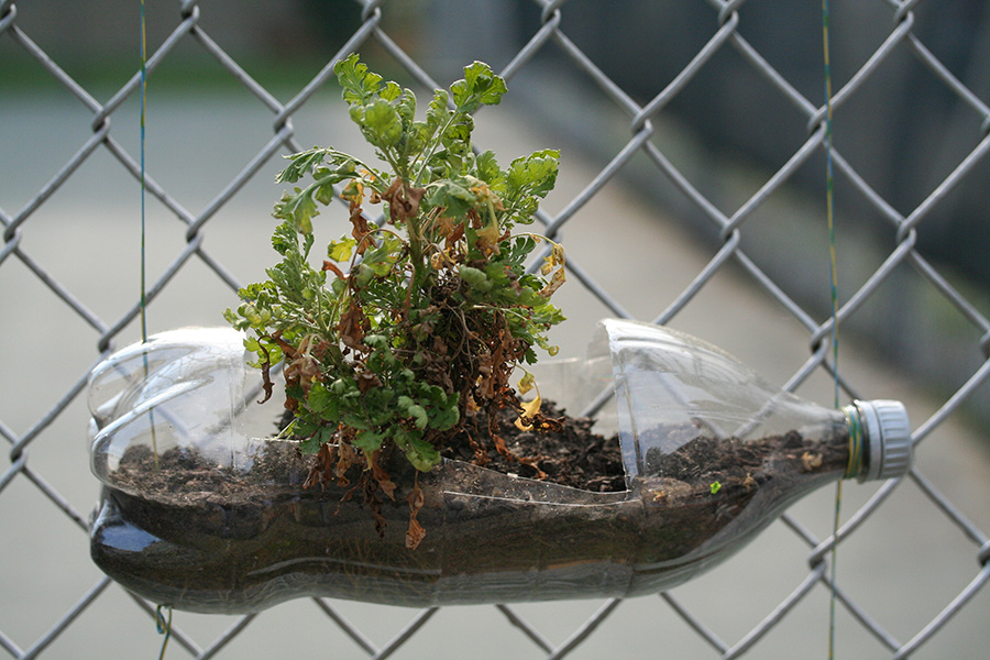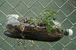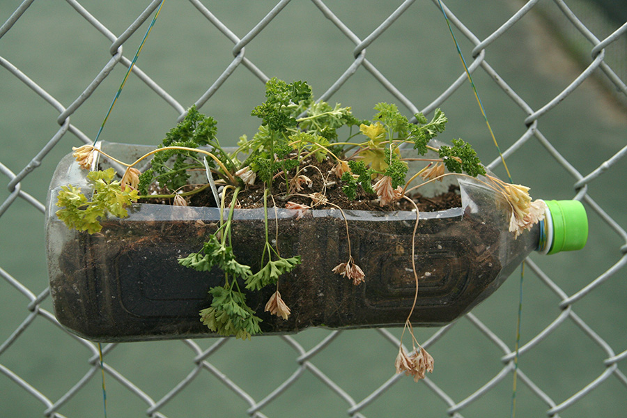 we contained walking until we came to the lesley tennis courts. along the chain-link fence were hung makeshift garden containers made from hollowed up 2 liter soda bottles. guerrilla gardening or abandoned college project? whatever it was the plants growing inside seemed neglected. there were a few different types of parsley, one with thyme, and another with a tomato. i noticed there was no drainage holes at the bottom. it's definitely a cool idea though, and maybe some of the community gardeners up against the chain-link fence could do something similar.
