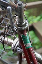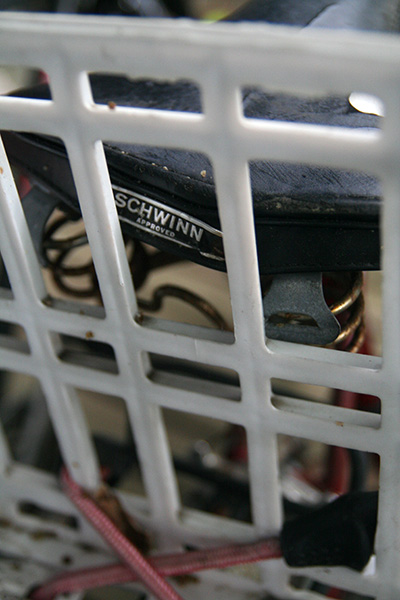 once i got the bike home i took a photo of it before storing it away temporarily on my backyard deck. from my initial cursory inspection, it's a schwinn lady 10-speed. it's got a wald basket in the front, and a milk crate basket on the back strapped to a rear rack. it has chrome fenders that are a bit rusty but hopefully can be polished clean. the brakes are center-pulled calipers. in a former life this bike lived on the dartmouth campus as it still has a security sticker. the right pedal is busted, but still works if you're careful. the original schwinn saddle is a bit torn but still usable. the frame is a bit tall and sitting on the seat i can't touch the ground with my feet but i can still get a good riding position. it'll be fun restoring this bike.