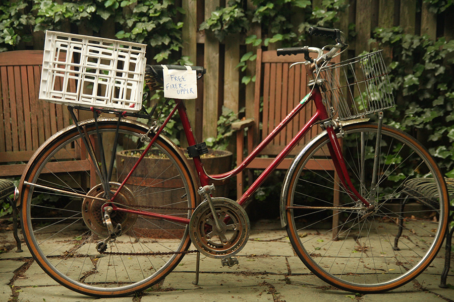 after parking my motorcycle back at home, i decided to walk down to wendell street to investigate that bike i saw. i bumped into jeff and his dog and they both accompanied me. i thought maybe the bike was gone until i saw it. sure enough, the note read, "free fixer-upper." i immediately grabbed this free bike.