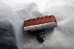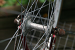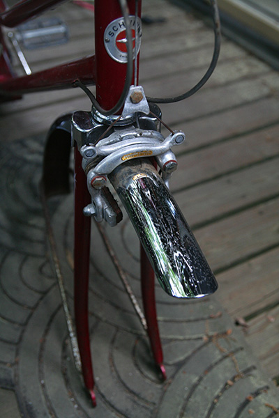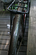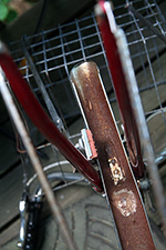 in order to do a more thorough cleaning of the front fender i had to remove the front basket; but in order to do that i needed to remove the wheel completely, and the wheel wouldn't come off until i removed one of the brake pads. once properly exposed, i was able to see the underside of the front fender: if i thought the rust was bad on the top, the bottom was much worse. it'll need to get heavy duty on it, perhaps use a brillo pad over the sink.