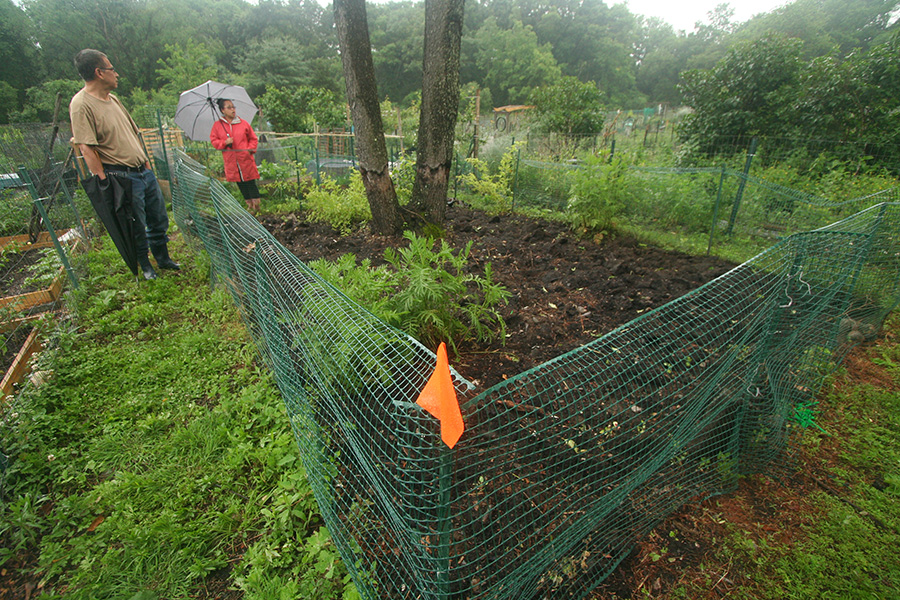 after an early dinner, i went down to the community garden by rock meadow (3 miles way) with my father and sister. the rain had picked up again, and the garden plot map i printed out quickly became soggy. we were there 15 minutes early so we went to check out the 4 available plots. 2 of the plots were bad: one had a wall of pine trees on the western side, another plot was not only the smallest one but had a tall black cherry tree growing dead center. the other 3 plots were excellent, big with plenty of sun exposure.
