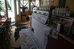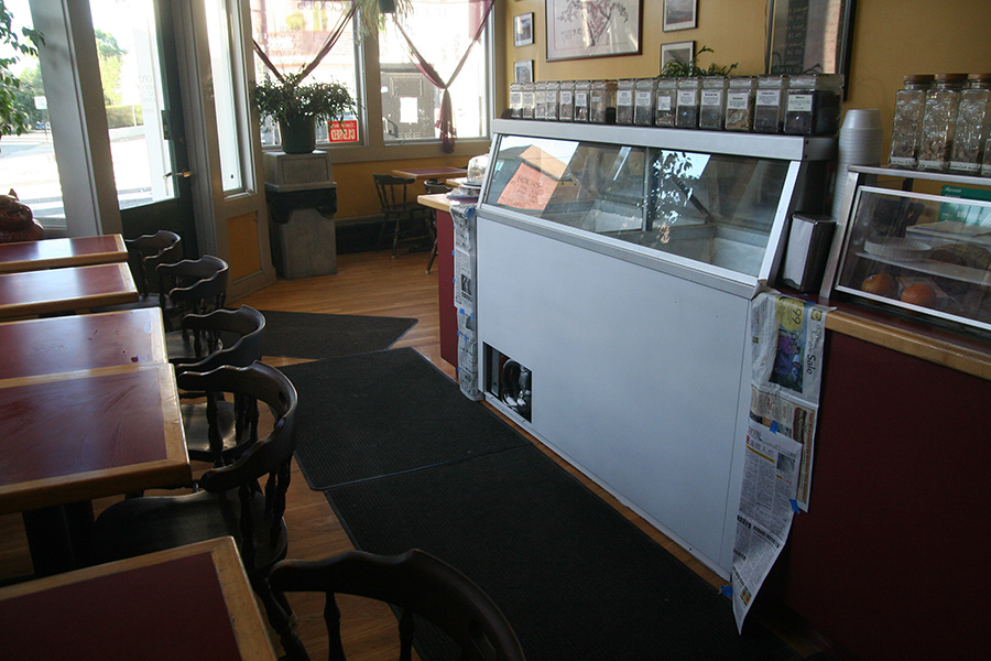 when my mother went to go pick up my father from the cafe around 4:30, i went with her. they've been meaning to repaint the rusty facade of their ice cream freezer but haven't had time to do it. i knew if i didn't push them into it they'd never find time. we already bought the spray paints, a can of primer and a can of glossy white. as soon as i arrived i scuffed the surface with a piece of sand paper. i brought the random orbit sander as well but that would've been overkill. after wiping clean the surface, we taped the sides to prevent spray paint from getting on them.