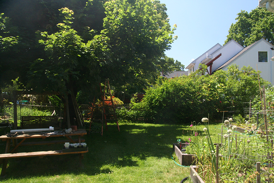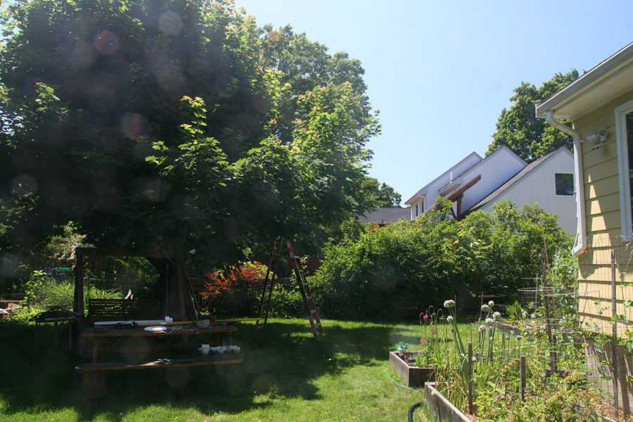 with the robin nest up in the maple tree now vacant, i could go ahead and prune some branches in order to reclaim some sun exposure for raised bed 3. as the afternoon advanced, i paid attention to where the shadow of the tree was landing. not confident enough to use the chainsaw, i only used manual tools instead.