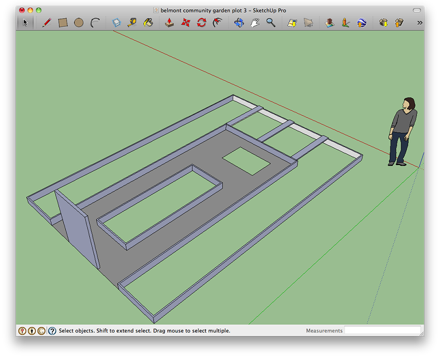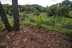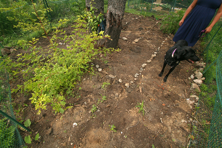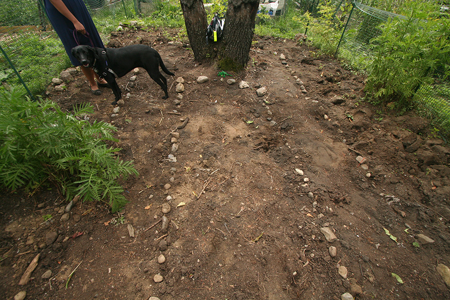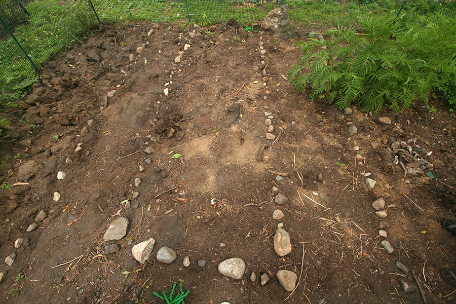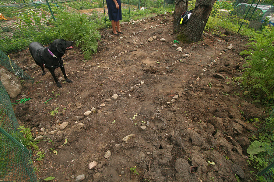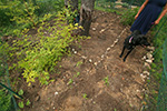 armed with my father's blueprint, i laid out rocks so i could get a feel for the eventual shape. basically it's a long u-shaped raised bed (with the bottom of the U facing south) with another raised bed in the middle along with the tree. since our plot is so small, we tried to maximize the total amount of growing area. kathy the garden coordinator was there, trimming the paths with a weed whacker. she was with a friend who came by and critiqued our plot as if we weren't there. it was another bright but hazy overcast day so i couldn't see where the shadows fell. there was a bunch of carpenter ants foraging around the base of the tree; does it mean the tree might be unhealthy and die soon? one can only hope.