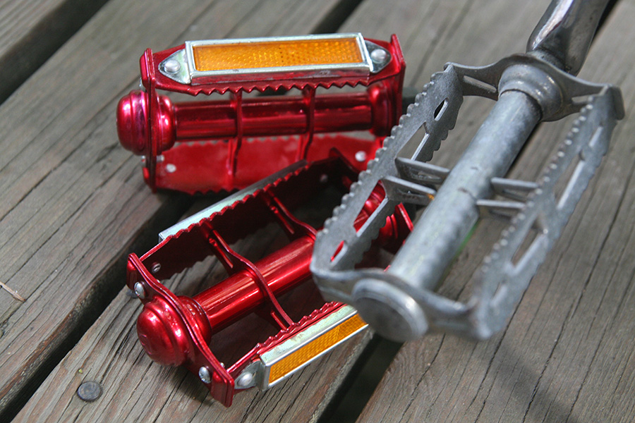 when i came back i installed the vintage red wellgo pedals onto the schwinn super sport. the red of the pedals isn't an exact match to the red of the frame but close enough. the only thing left to do on that bike is possibly clean up the rusty fenders a bit more, but the bike itself is in rideable shape (i'll take it out on a test ride tomorrow).
