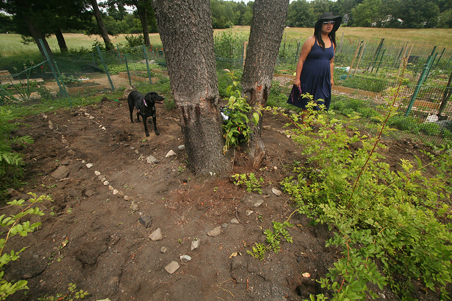 my sister wanted to see the garden (along with the dog) so i got her to drive. first stop was town hall, where i hand-delivered a check, making us officially the proud owner of plot 136 (at least for one season). then up concord avenue we went to the community garden.