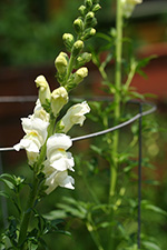 white snapdragons have already emerged at my parents' place but they're only now emerging in my own community garden plot. the snapdragons as a whole are doing very well in my garden, partly i think because they get more sun exposure than at my parents' place. so far only pinks and whites, i haven't seen any other colors here.