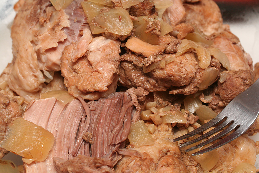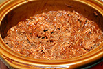 i returned home by 1:30, fearful that the unsupervised crock pot had boiled over (it didn't, but it did later, while i was home). i flipped over some of the pork that were on top and looked a bit dry. the meat itself smelled like barbecue due to the liquid smoke addition.