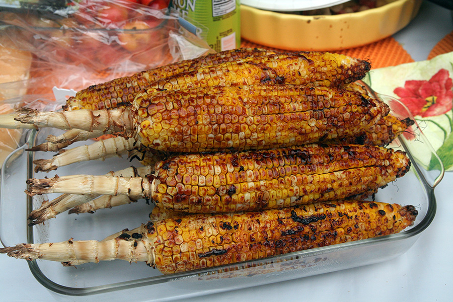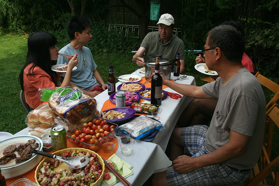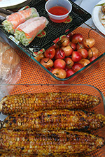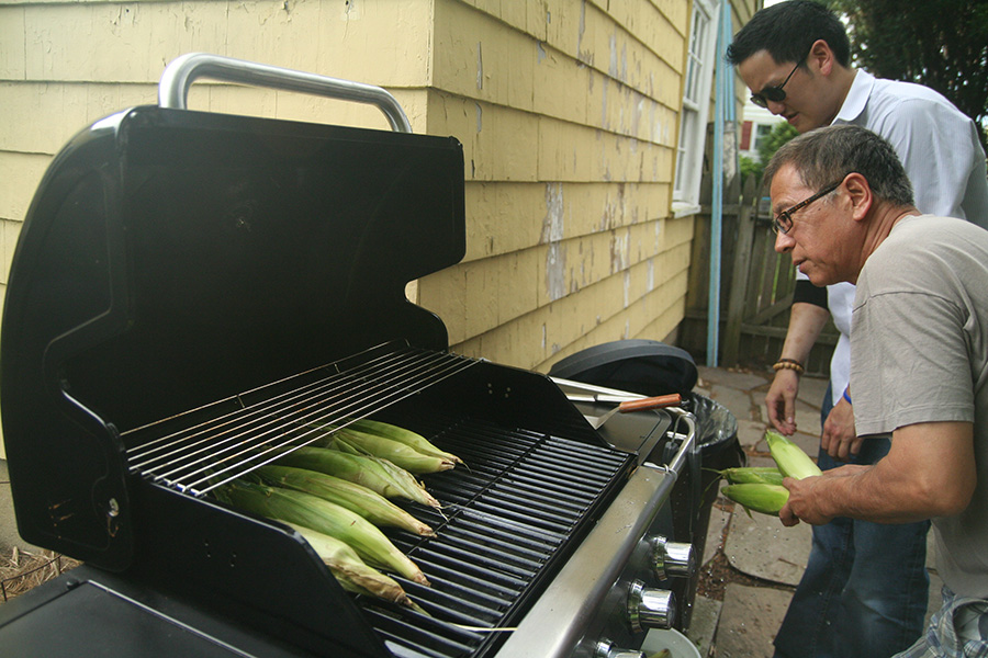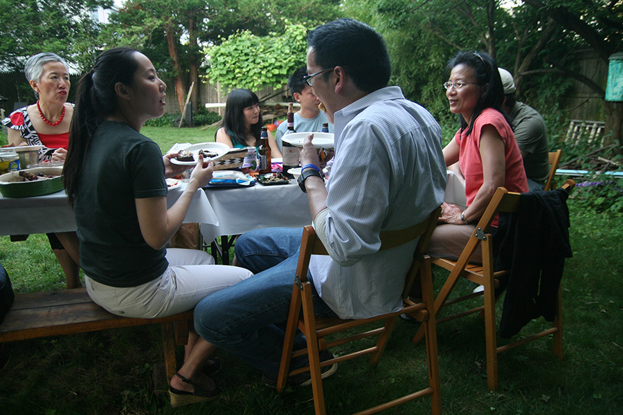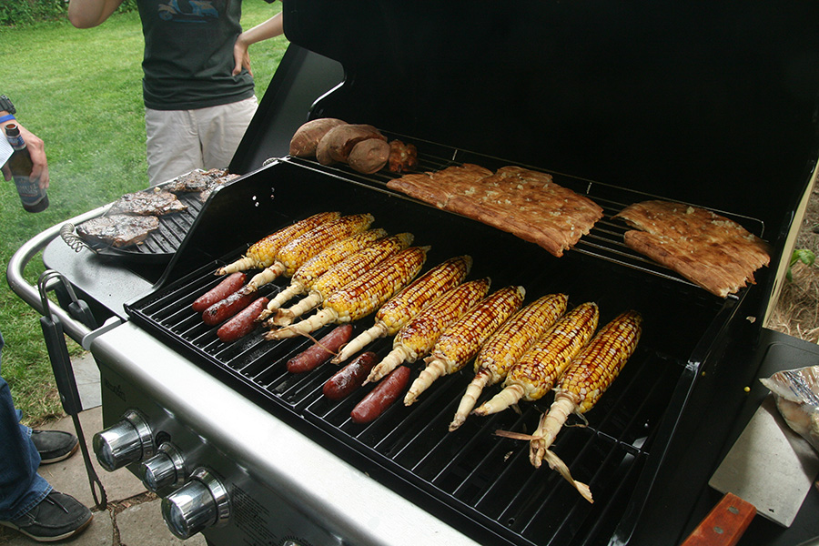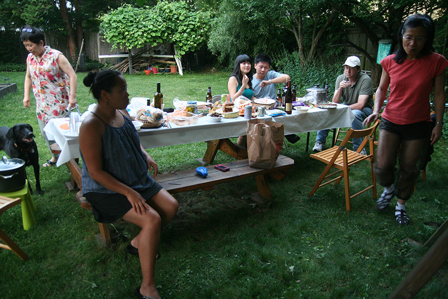 i ended up working the barbecue along with jack and his girlfriend, so we three probably ate the least. they were cooking xinjiang kabobs and steaks on the griddle while i was in charge of the barbecued corn. i also had a foiled packet of previously-soaked frozen mesquite wood chips but they never smoked up. because i made pulled pork there was no burgers this time. my mother also made an assortment of chinese zongzi but with so much barbecued foods available, i don't think anyone had any so many took some home afterwards when people started to leave around 9:00.