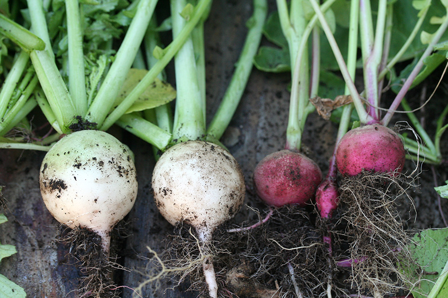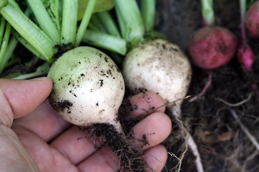 i wasn't sweaty from the bike ride (i purposely went slow) but after spending some time in the backyard weeding and watering the plants, i had to take another shower. my mother dug up some radishes.
