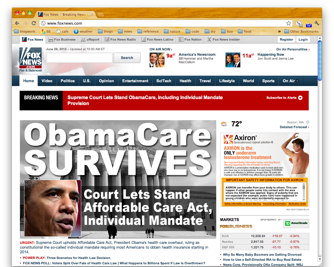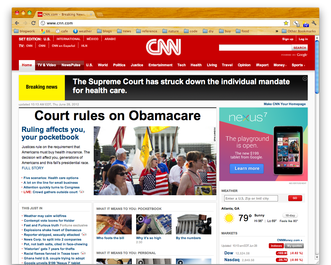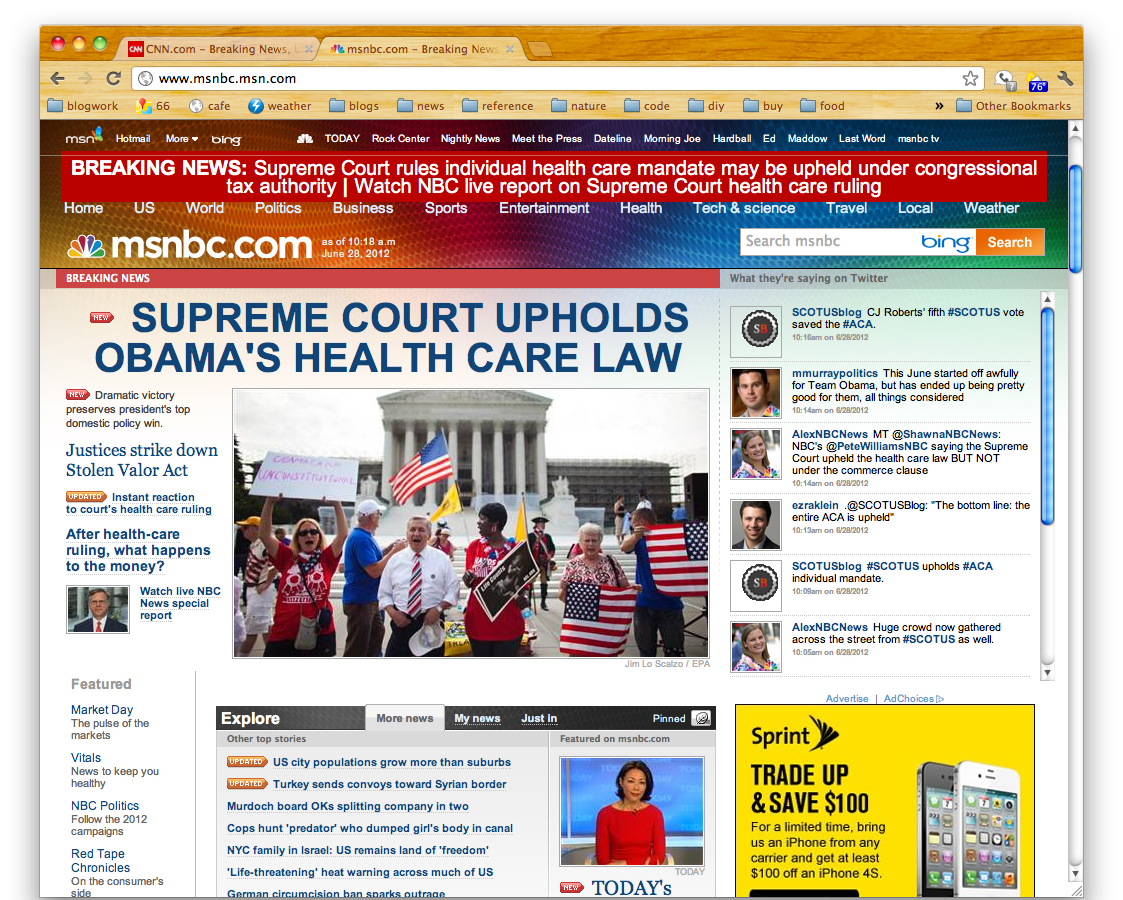 i woke up just in time to catch the announcement of the supreme court ruling on obama's health care law. the first few minutes were confusing, as reporters quickly skimmed through the documents to determine whether the law would be upheld or struck down. at first it seemed like bad news for the administration, but then it turned out to be good news. when they announced the split, i was surprised (like many people) that supposedly conservative chief justice john roberts was the deciding vote that sided for the health care law.