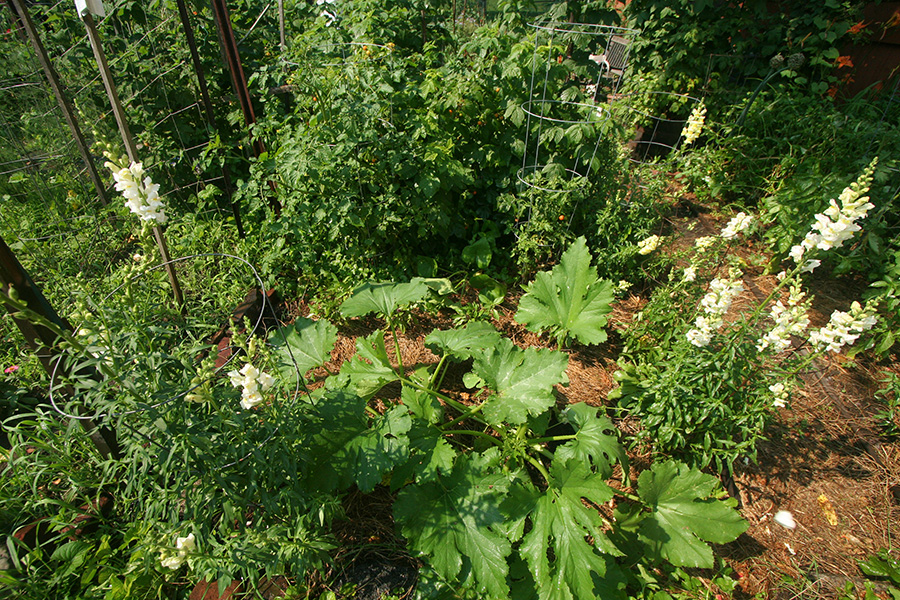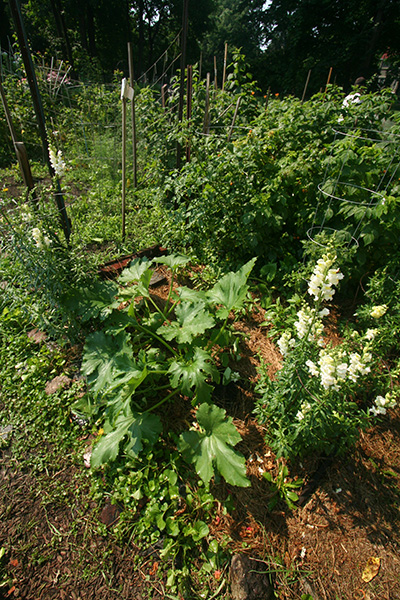 the biggest surprise in the garden was the size of the squash plants. i hadn't been there in 9 days and already they looked like jungle plants. the zucchini even had a flower that was about to bloom, and the fast-growing squash nearby would have flowers as well any day now. naturally the emerging flowers worry me because they attract squash vine borers, but with so many other gardeners growing squashes as well, there might be safety in numbers.
