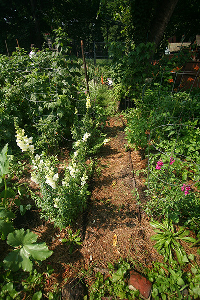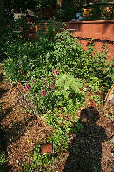 back in cambridge, i changed into some shorts, grabbed my gloves, and went to the community garden to do some weeding and watering. stacy in plot 20 was there but she didn't say hello until she left. she did check out my plot and said i had a nice garden (nobody has ever said that before in the 7 years i've been there). stacy told me that christie in plot 19 (behind the mulberry tree) had given up on trying to grow anything. i didn't have to do too much weeding; what little i did was easy because the weeds were easy to see on the salt marsh grass mulch.