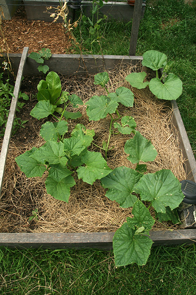 back in belmont, i watered the garden. yesterday i added some salt marsh grass mulch around the cucumber plants growing in RB1. i thought they were a bush variety but now i'm so sure.