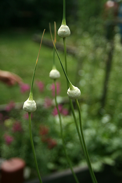the information on the packet didn't say anything, just said to plant them flat on the ground, 3-6 seeds. the plants are still early enough that we can train them to grow in whichever direction we want. there's plenty more space in the rest of the raised bed. elsewhere, the garlic flower buds - which were formerly drooping - have now all straightened out. i don't think i've ever seen this kind of garlic flower before since i usually harvest them for the scapes during the spring.