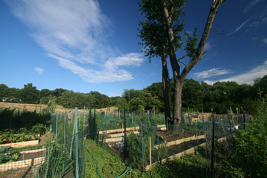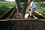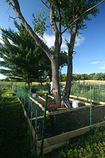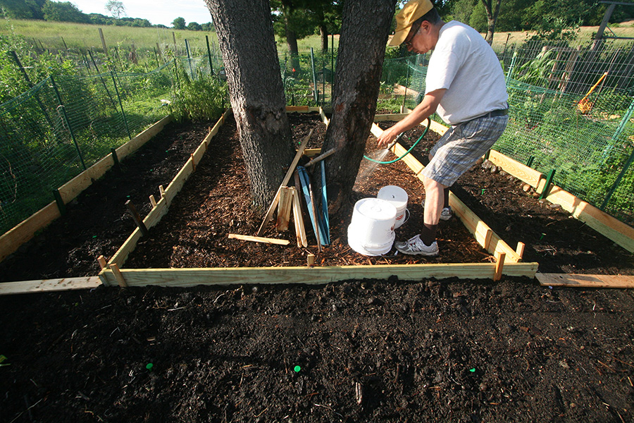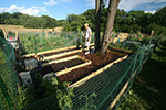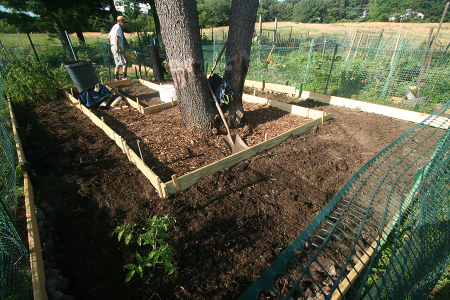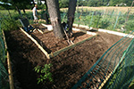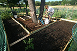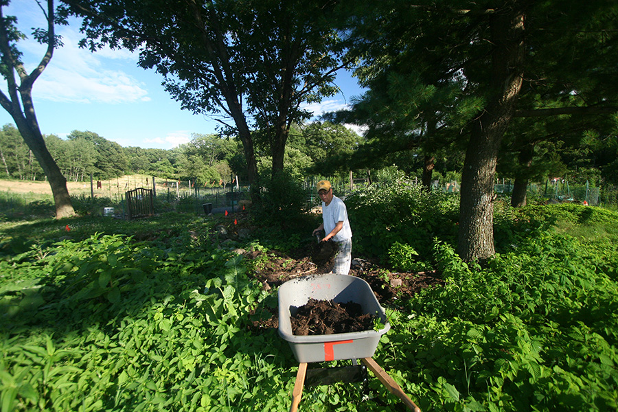 the walls of the raised beds were pretty much done so there was nothing left to do on them other than to put down a few more stakes around the boards that still felt loose. my father began collecting aged manure from the manure pit behind the grove of pine trees behind our plot. he was using large plastic buckets which seemed to slow; what we needed was a wheelbarrow. so we went down to the mulch supply located at the front of the victory garden, where there were several public-use wheelbarrows. we ended up hauling back 4 wheelbarrow's worth of wood mulch to be used on the short paths inside our plot. they weren't the best (a lot of twigs) but still usable and free.