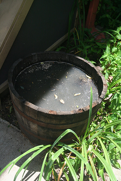 here's the story: steve bought a pair of halved wine casks to be used as planters; what he didn't realize was they weren't drilled so rain water just collects inside, mixing with the dirt to create a stinking filthy mess (smelled like vomit), a perfect breeding ground for mosquitoes. i brought it up with him last month after i couldn't stand the smell anymore; he said he'd take care of it but never did.