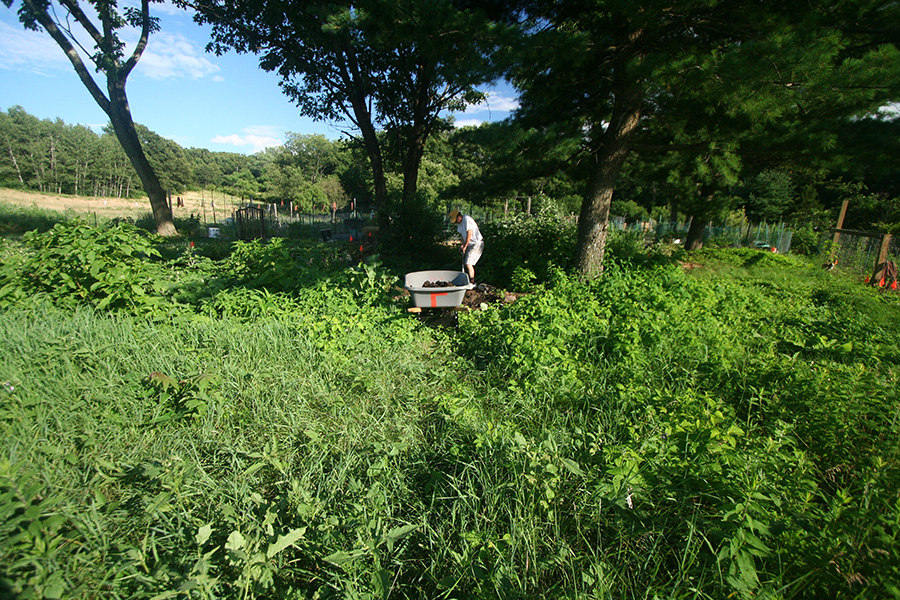 we returned one wheelbarrow and kept the other to haul back the manure. the first time we used a circuitous route before figuring out there was a shortcut just behind our plot. like the wood mulch, the aged manure wasn't the greatest either, since most of the other gardeners had already taken their fill earlier in the growing season. what we had had some weed plants already growing in them (which we easily pulled out), but like the mulch, it was still usable and free for the taking. we ended up hauling back 3 wheelbarrow's worth of aged manure but a few buckets.