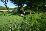 i was kind of tired at that point and thought about returning home, but my father was insistent we plant some seeds today, since we were already in the middle of the growing season, and if we waited any longer, there might not be enough time for some of the slower plants to reach maturity for harvesting. i used the leftover plastic green landscape fabric pegs as markers to where we planted. since we had a lot of growing space, i spaced them 2-3 feet between markers.