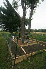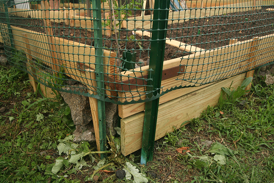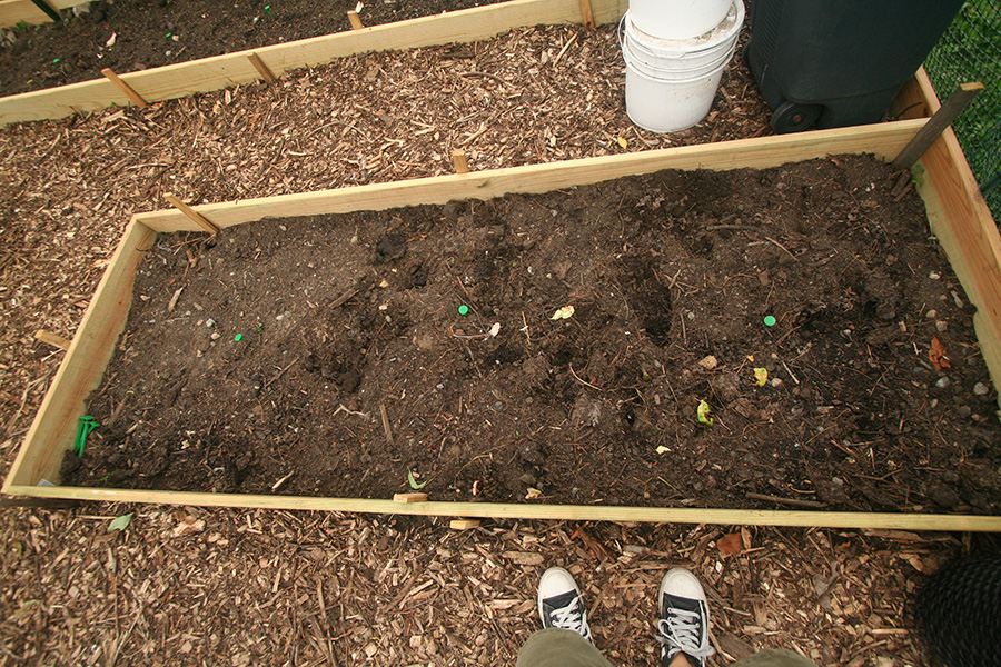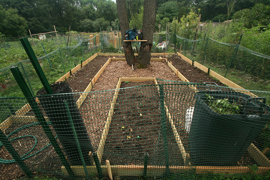 after some weeding, we took new measurements of the perimeter. the plot is glaringly unsymmetrical: 14'2" x 20'3" x 19'1" x 13'10". that means a perimeter that's 64 feet and 4 inches long, a number that will be useful if and when we decide to buy better fencing to keep out the critters. initially we figured it was chipmunks, but now i think it might be rabbits. our raised beds aren't particularly high - just 6" - compared to the 12" height of our backyard raised beds.