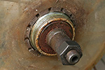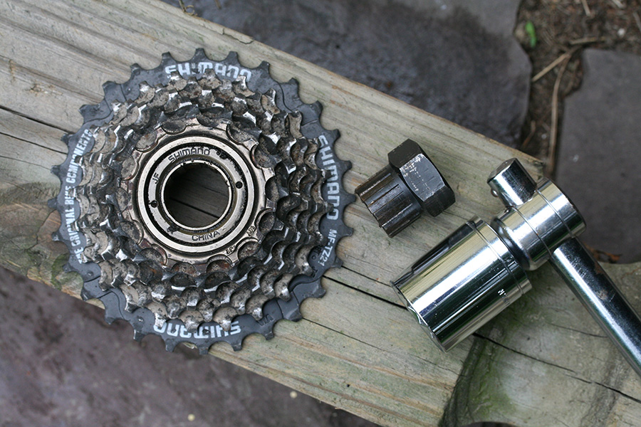 after we finished eating, my father helped me remove the freewheel using a socket big enough to fit the freewheel remover and a solid wrench (as opposed to a ratchet wrench). we also had a length of pipe that gave us a torquing advantage of several feet. earlier i installed a tire on the old wheel so we could get a better grip (the free kenda komfort tire which i managed to install without any tools). bracing ourselves for the massive opposing torquing forces required to release the freewheel, we were pleasantly surprised when the freewheel simply loosened without incident.