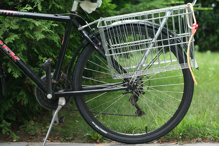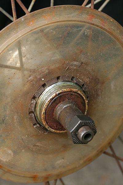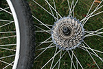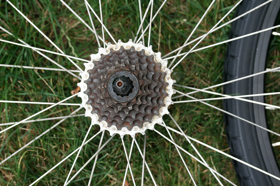 after i cleaned off the grease and dirt from the removed freewheel, it was a simple matter of threading it onto the threaded hub of the new wheel. i removed the spare mountain bike back wheel from my trek and installed the new wheel.
